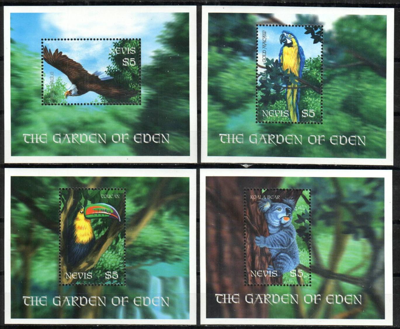 The Garden of Eden Koala bear, bald eagle, toucan, macaw Set of 4 souvenir sheets | NH | $11.80 | 1 |