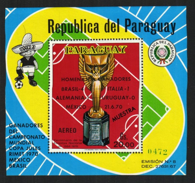 Brazil, Jules Rimet Soccer trophy, 1970 souvenir sheet | NH | $16.00 | 1 |